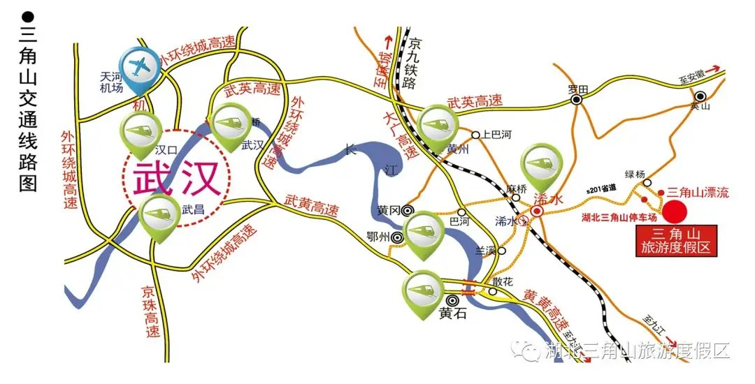 汉口站(终点站):乘坐动车、高铁或火车,至汉口火车站→金家墩长途汽车站→浠水环通客运站,到环通客运站对面的十月车站坐到绿杨的专线车到三角山路口下→坐景区转乘车到湖北三角山停车场